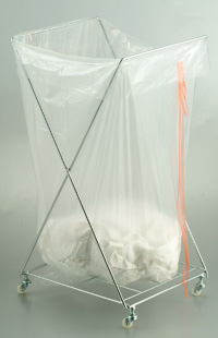 Stitched laundry bag is made of regular PE plastic with water soluble thread stitched along the side and bottom of the plastic bag. A strap is attached at top to close off the opening for laundry cleaning. It is mainly used at hospital to put infectious and unpleasant clothing, the bag will be opened itself in the cleaning process, thus staff at laundry does not need to remove the dirty clothing for the washing machine.